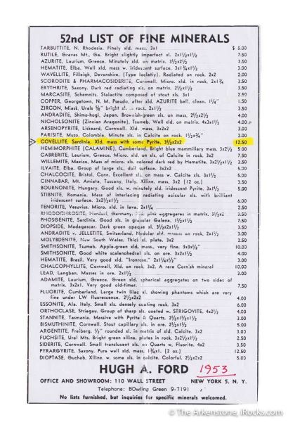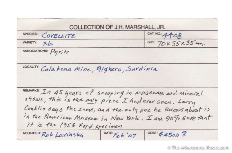This is a Covellite (circa 1800s) from Calabona Mine, Alghero, Sardinia, Italy. Italian covellite once set the standard for the species, and many people still consider the best of them to rank up there with the best (generally smaller but sharper crystals) from Butte in Montana.Data last checked on 25th Feb 2026