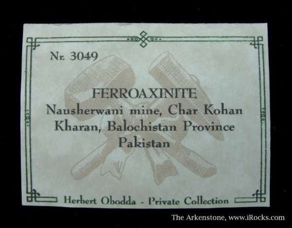 This is a Ferroaxinite from Nausherwani Mine, Balochistan Prov., Pakistan. A rare locality piece of axinite, very seldom seen from these alpine pegmatites.Data last checked on 30th Jan 2026 - specimen may no longer be available