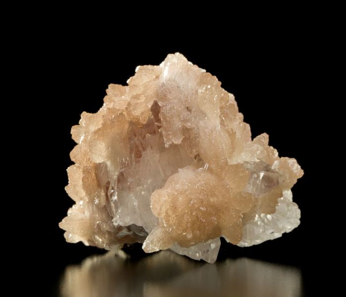 This is a Olmiite on Calcite from N'Chwaning 2 Mine, Kalahari, South Africa. A highly unusual specimen exhibiting SINGLE CRYSTALS of olmiite, arranged as if feathers draping a cap over the cluster of extremely glassy, large, very lustrous calcite scalenohedra at the core of this cluster.Data last checked on 25th Feb 2026 - specimen may no longer be available