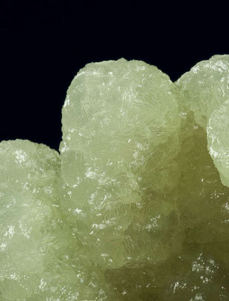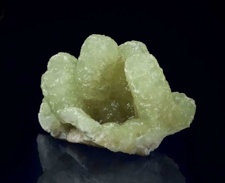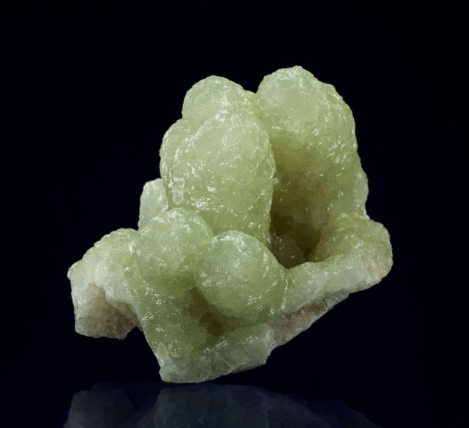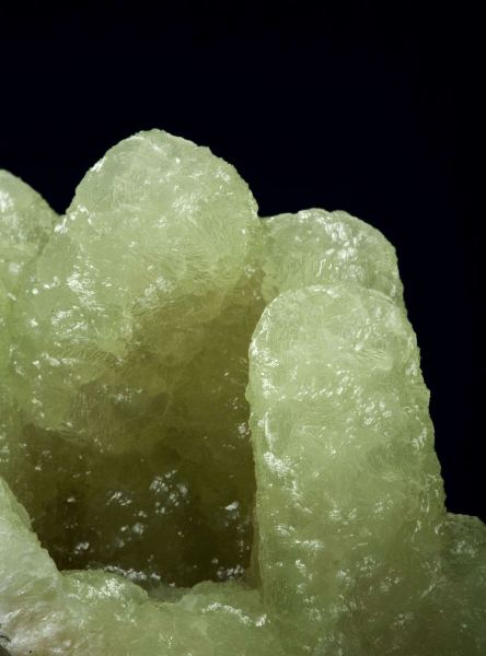 This is a Prehnite Cast After Anhydrite from Prospect Park Quarry, Prospect Park, Passaic Co., New Jersey, USA. This is an undamaged, sculptural cluster of very lustrous, translucent, light apple-green prehnite in fingers to 3 cm in length.Data last checked on 13th Feb 2026 - specimen may no longer be available