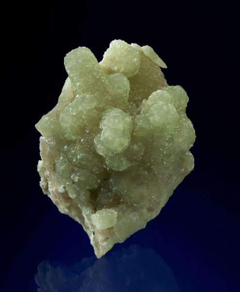 This is a Prehnite Cast After Anhydrite from Prospect Park Quarry, Prospect Park, Passaic Co., New Jersey, USA. A sculptural cluster of very lustrous and translucent, light apple-green fingers of prehnite.Data last checked on 16th Jan 2026 - specimen may no longer be available