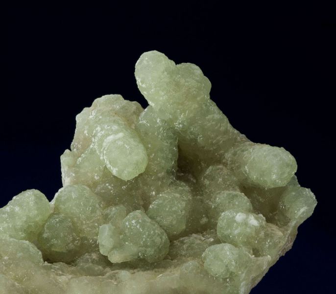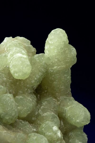 This is a Prehnite Cast After Anhydrite from Prospect Park Quarry, Prospect Park, Passaic Co., New Jersey, USA. This is a solid plate of very lustrous and translucent, light apple-green fingers of prehnite to 4.5 cm in length.Data last checked on 27th Feb 2026 - specimen may no longer be available