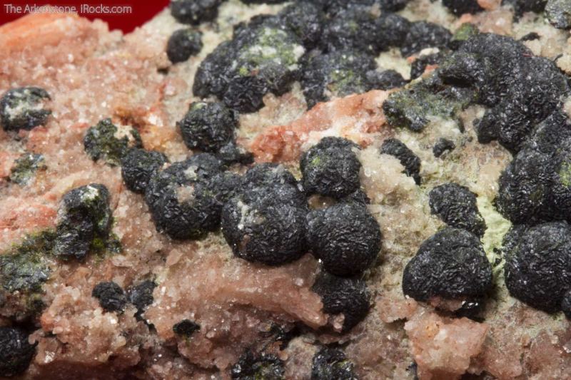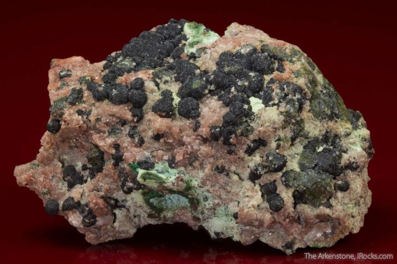 This is a Vesignieite from Mashamba West mine, Kolwezi district, Katanga Copper Crescent, Katanga (Shaba), Democratic Republic of Congo. Dark green botryoids and botryoidal aggregates of vesignieite from 1.5mm to 1.5cm are distributed on a fine-grained, flesh-colored carbonate matrix with light green copper secondary minerals.Data last checked on 7th Feb 2026 - specimen may no longer be available