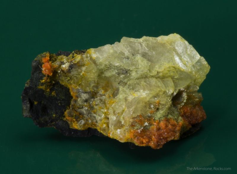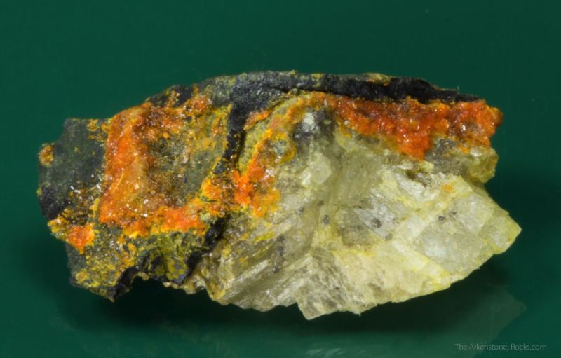 This is a Huemulite and Pascoite from H14F Uranium mine #21 (Shaft #21 mine), Pribram-Haje, Central Bohemia, Czech Republic. Yellow-orange huemulite and orange-red pascoite form a crust along a veinlet of white calcite.Data last checked on 28th Jan 2026 - specimen may no longer be available