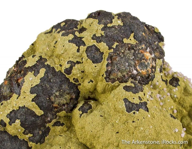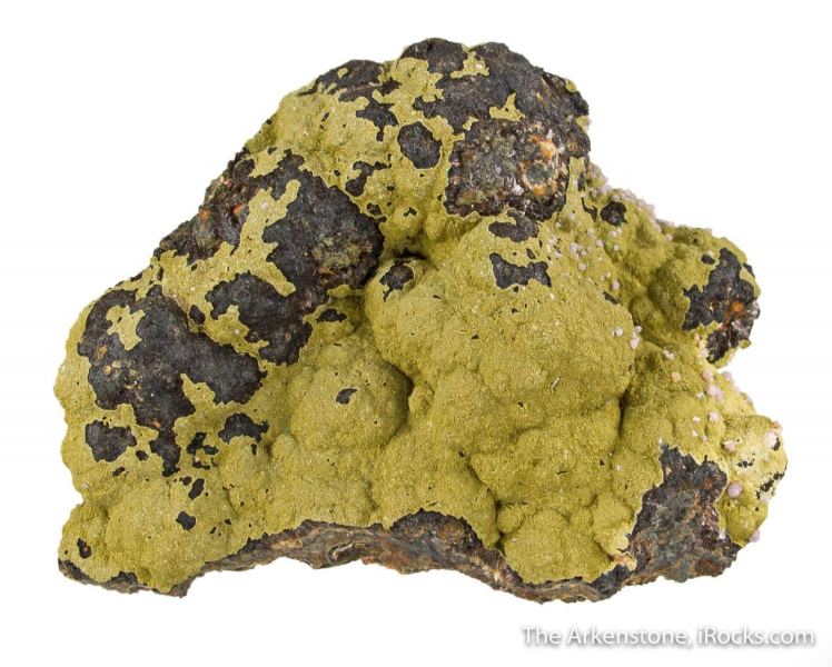 This is a Kidwellite with Strengite on Beraunite from 3 Oak Gap, near Mina, Polk Co., Arkansas, USA. A mounded surface of beraunite and possibly dufrenite and rockbridgeite is covered with a vibrant olive green coating of kidwellite, a rare hydrated sodium iron phosphate hydroxide, which is augmented by 1mm, spheres of pale pink to lavender strengite, especially on one side of the piece.Data last checked on 28th Jan 2026 - specimen may no longer be available