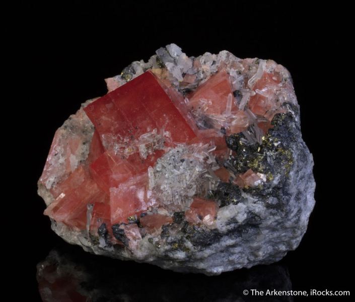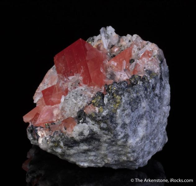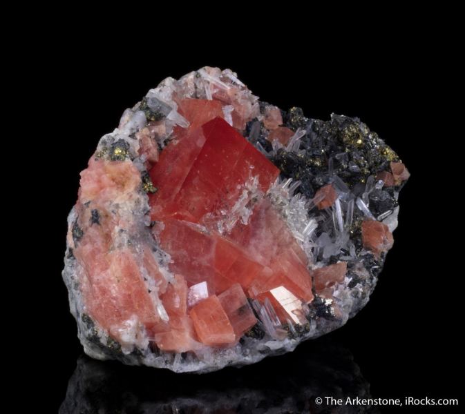 This is a Rhodochrosite on Quartz and Tetrahedrite from Sweet Home Mine, Alma, Park County, Colorado, USA. Nestled aesthetically in a shallow quartz vug are lustrous and translucent rhombs of CHERRY-red rhodochrosite, highlighted by a crystal 2.4 cm across.Data last checked on 20th Jan 2026 - specimen may no longer be available