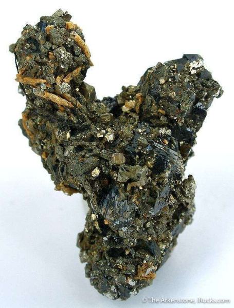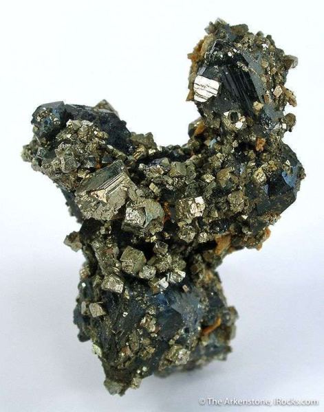 This is a Scorodite from Hezhou, Guangxi Zhuang Autonomous Region, China. Sharp lustrous scorodite crystals to 1 cm, sprinkled liberally with starkly contrasting golden pyrites.Data last checked on 17th Feb 2026 - specimen may no longer be available