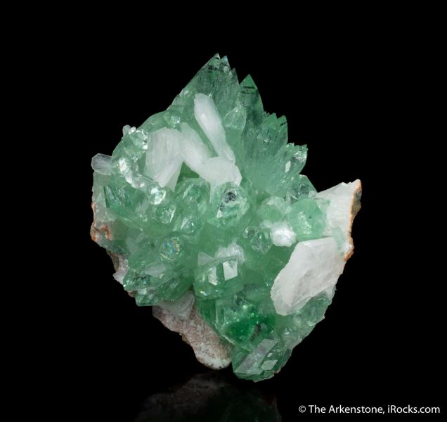 This is a Fluorapophyllite with Stilbite (old style) from Pashan, Pune Quarries, near Mumbai, Maharashtra, India. An aesthetic and classic cluster of gemmy, green Fluorapophyllite crystals accented by white Stilbite from the famous, and now-closed, Pashan Quarry at Poona as the old labels had it (now, Pune).Data last checked on 20th Jan 2026