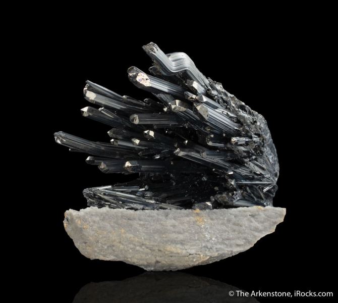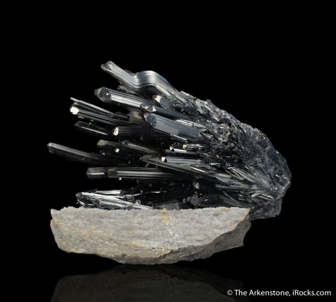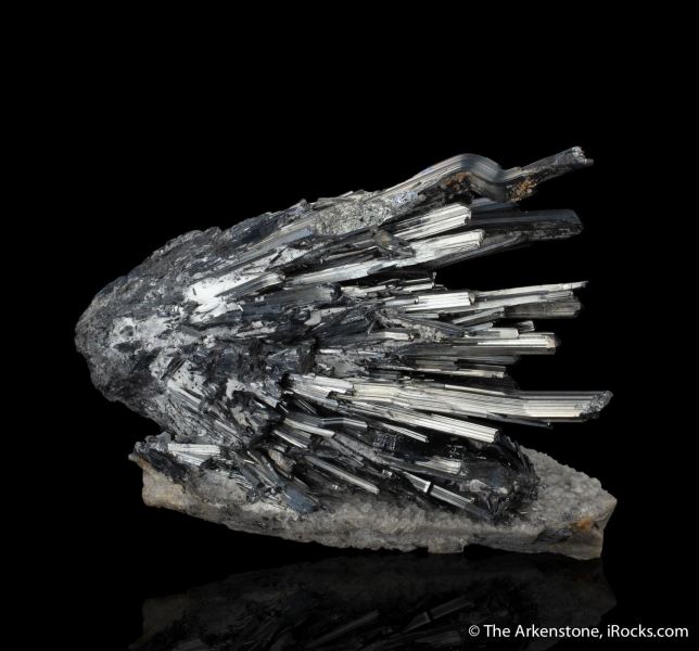 This is a Stibnite on matrix from Lushi, Lushi Co., Sanmenxia Pref., Henan Prov., China. A large and commanding spray of Stibnite from the Lushi area in China, a historic location which produced specimens during mining operations in the 1980s and into the 1990s, but not since.Data last checked on 25th Feb 2026