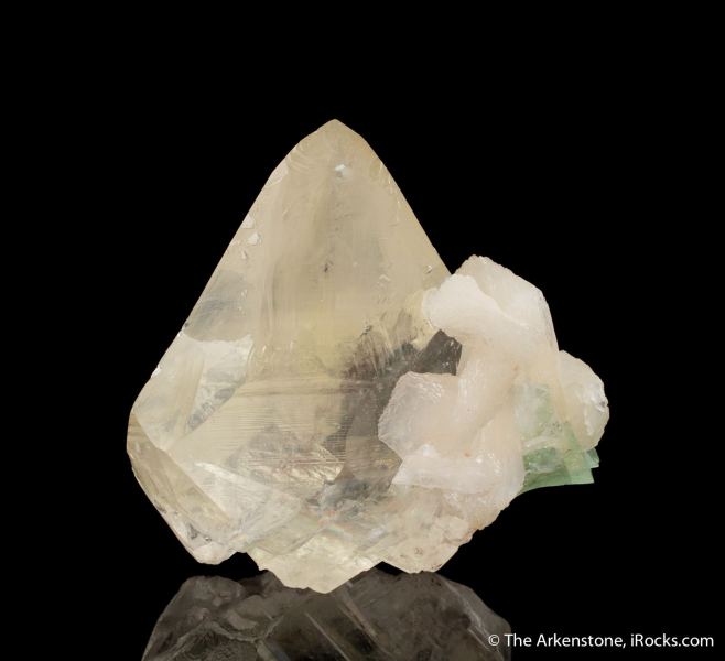 This is a Calcite with Fluorapophyllite and Stilbite from Jalgaon District, Maharashtra, India. A sharp, very gemmy and glassy, tapered Calcite rhomb is the centerpiece of this specimen and is embellished with a small cluster of white Stilbite and green Fluorapophyllite crystals.Data last checked on 16th Jan 2026 - specimen may no longer be available