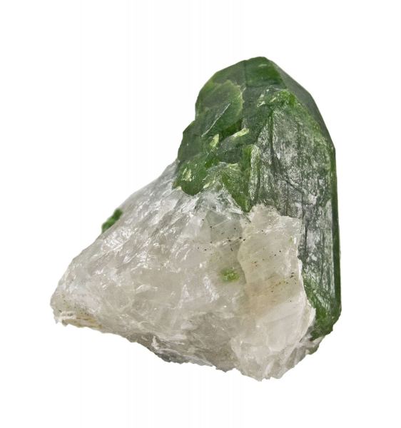 This is a Diopside (Chrome) from Outokumpu, Finland. Partially encased in a matrix of white marble, is a splendid, lustrous and partially translucent, doubly terminated, emerald green crystal of chrome diopside, 2.8 cm in length.Data last checked on 28th Jan 2026 - specimen may no longer be available