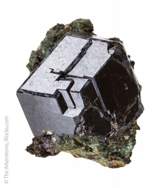 This is a Melanite Garnet from Unverhofft Gluck an der Achte Mine, Antonsthal, Breitenbrunn, Erzgebirge, Saxony, Germany. A large, well formed lustrous, black melanite garnet crystal, measuring 2.6 cm in length, is perched on a matrix composed of much smaller, green garnets.Data last checked on 7th Mar 2026