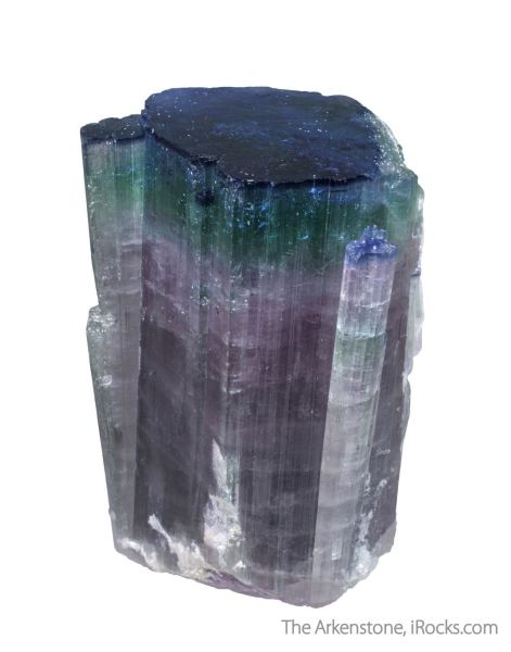 This is a Elbaite Tourmaline from Mawi Pegmatite, Nuristan, Laghman Province, Afghanistan. This highly unusual example of a "bluecap" elbaite crystal from Afghanistan exibits a range of lovely colors starting with a 1 mm thick shiny bluecap termination, grading downward to a 4 mm thick light sky blue layer, then to an 8 mm thick bright apple green, and finally to a pinkish purple through the lower 2/3 of the crystal.Data last checked on 1st Feb 2026 - specimen may no longer be available