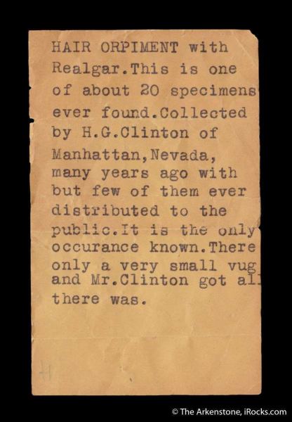 This is a Wakabayashilite on Calcite from White Caps Mine, Manhattan, Toquima Range, Nye Co., Nevada, USA. This is one of the most rare and strange of old USA mineral species, not found since the early 1900s here, and almost legendary among collectors of such old and esoteric minerals.Data last checked on 28th Jan 2026