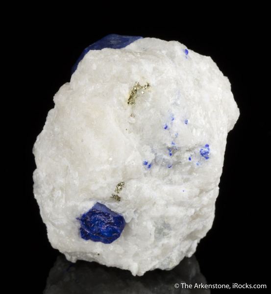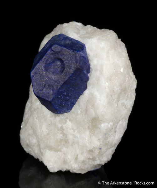 This is a Lazurite from Sar-E-Sang, Badakhshan Province, Afghanistan. Perched aesthetically on snow white marble is a single, doubly terminated, matte lustered lazurite crystal, measuring 2.2 cm in length.Data last checked on 15th Feb 2026 - specimen may no longer be available