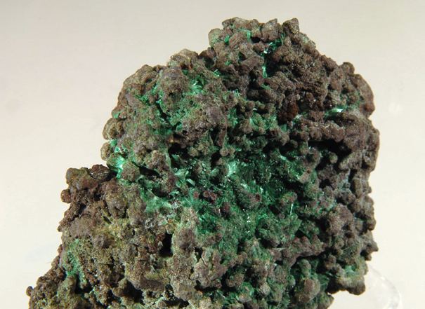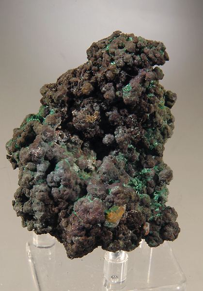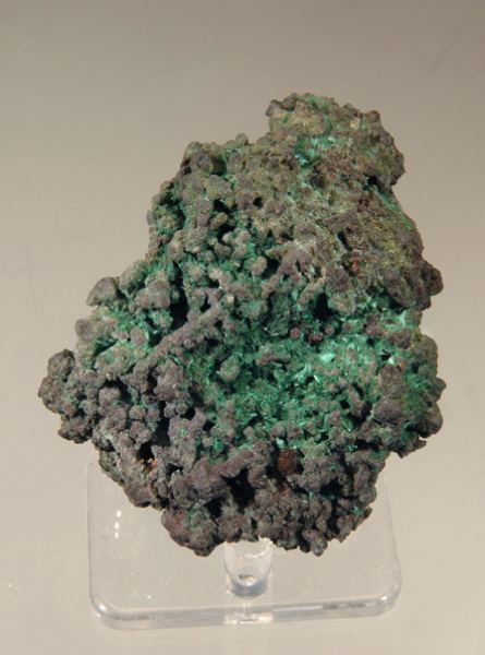 Another classic Bisbee association, in an unusually fine specimen this is almost all native Copper in crude crystals. The Copper is a pseudomorph after Cuprite, with some unaltered zones and small Cuprite octahedrons that still have red color. Fibrous crystallized Malachite sprays add a rich green color. Magnification reveals some Calcite that is green colored due to the Copper. The definition of this piece is excellent, it is quite old it was sold by Schortmanns in the 60's and comes with that old label. From: Well-Arranged Molecules