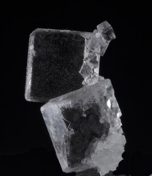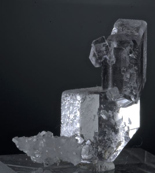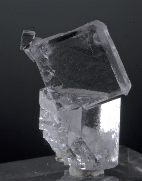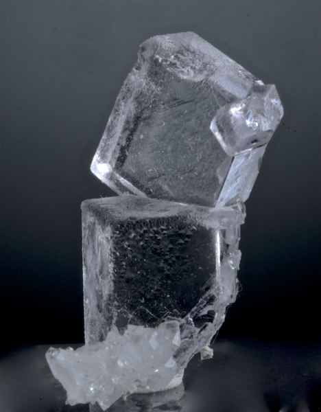 A pair of edge modified cubes of transparent Fluorite in an esthetic cluster. The condition is incredible with textbook perfect form, the color a light violet and the one crystal is tabular. An excellent large thumbnail, it is hard to capture the clarity and form in photos, in person it is especially impressive. The faces appear glass-like and smooth at first but on close inspection with good lighting the surfaces are covered with tiny geometric growth structures. A few very tiny Fluorite cubes are perched on this as well, and there is a shard of snow-like Quartz matrix that adds a nice sparkle. Aside from a small cleave on the underside of the lower crystal (not visible on display) this is perfect from all points of view, competitive quality. From: Well-Arranged Molecules