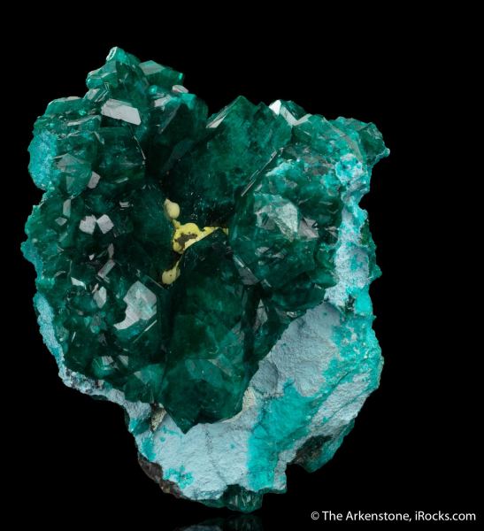 This is a Dioptase with Shattuckite and Chrysocolla from Reneville Mine, Reneville, Kindanba, Pool, Republic of the Congo. Incredibly intense, emerald green, doubly terminated Dioptase crystals, to just over an inch, highlight this handsome small cabinet-sized piece from Reneville in the Republic of the Congo.Data last checked on 20th Jan 2026 - specimen may no longer be available