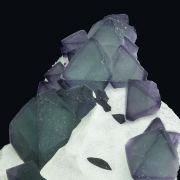 Nicely isolated octahedrons of Fluorite of different sizes and colors are perched on etched, white Quartz matrix. The larger Fluorites, measuring to 28 x 26 mm, have green cores and purple edges, and the smaller Fluorites are light purple with darker purple edges. The photos do not capture the nice green to purple color transition in the Fluorites. This mine is no longer producing, and this specimen is an very good example in perfect condition. ex. Carolyn Seitz collection