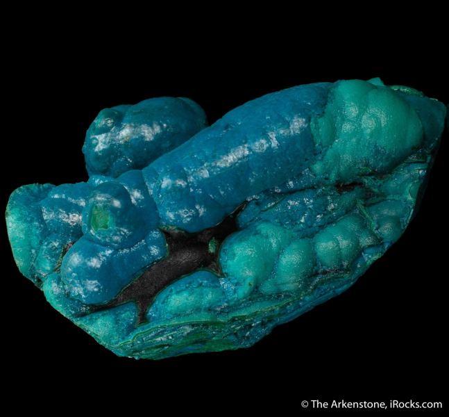 This is a Chrysocolla on Malachite from Star of the Congo Mine, Lubumbashi, Haut-Katanga, DR Congo. Here we have a beautiful and unusual stalactite combination of two colorful copper species mixed together, that includes an underlayer of botryoidal Malachite that is covered by a more lustrous and bubbly, thin crust of glossy blue Chrysocolla.Data last checked on 22nd Jan 2026