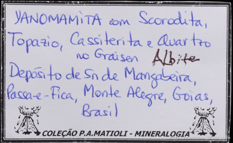This is a Yanomamite (type locality) with Albite, Scorodite, Topaz, Cassiterite and Quartz from Mangabeira deposit, Monte Alegre de Goias, Goias, Brazil. Yanomamite is an exceedingly rare indium arsenate hydrate from an unusual tin-indium zone of mineralization in the Mangabeira Granitic Massif in the Goias State of Brazil and is the type locality.Data last checked on 26th Jan 2026