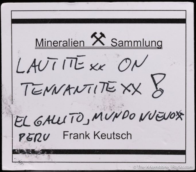 This is a Lautite on Tennantite with Quartz from El Gallito, Mundo Nuevo Mine, Mundo Nuevo, Huamachuco, La Libertad Dept., Peru. Lautite is a relatively rare sulfosalt and occurs nowhere more abundantly, or in more attractive combinations specimens, than at El Gallito, Mundo Nuevo Mine, Peru.Data last checked on 1st Mar 2026 - specimen may no longer be available