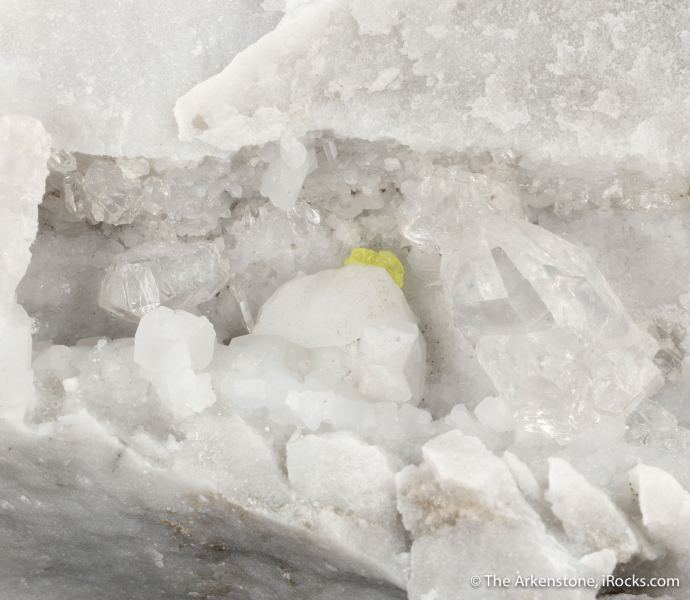 This is a Quartz with Sulfur in Marble (Old classic) from Carrara, Massa-Carrara Province, Tuscany, Italy. Here is a very rare and interesting Quartz specimen from the Carrara marble quarries in Italy, valuable mines that have been almost continually worked since Roman times.Data last checked on 28th Jan 2026