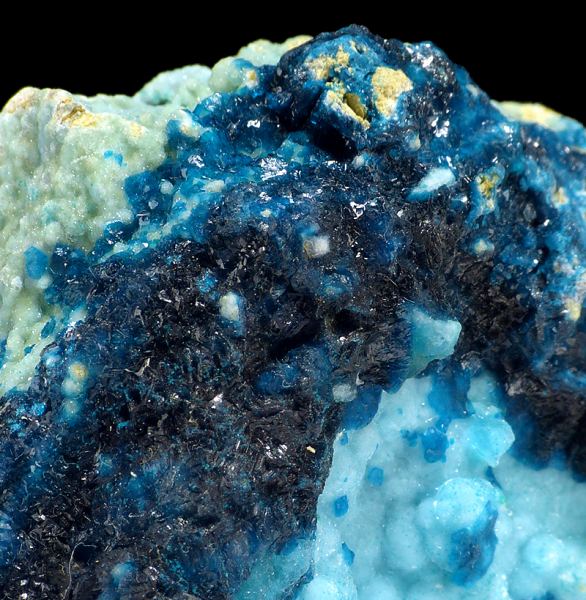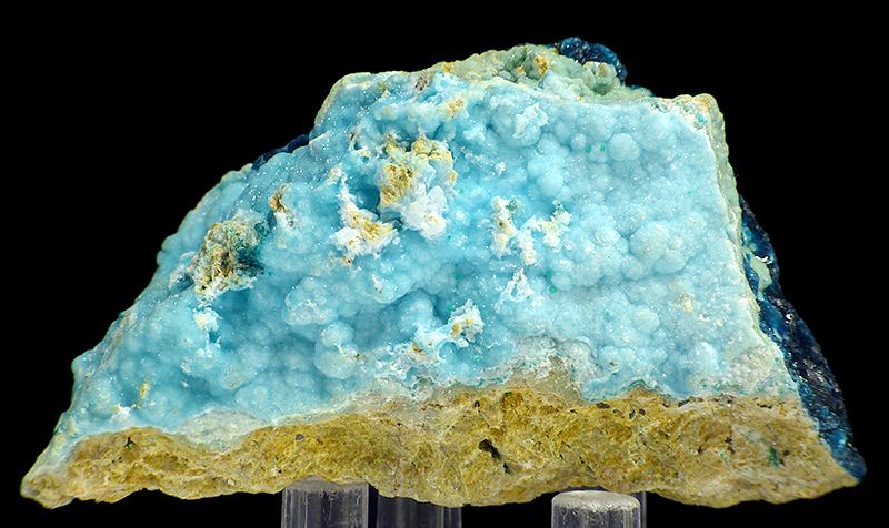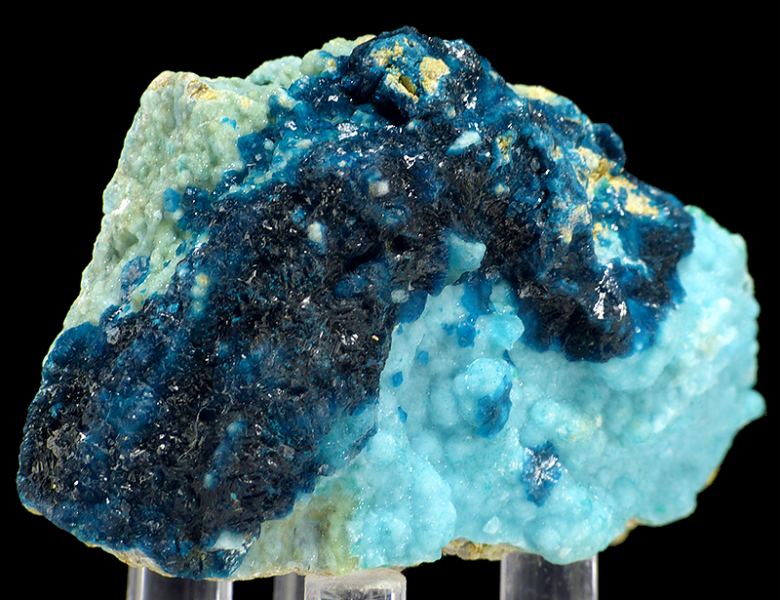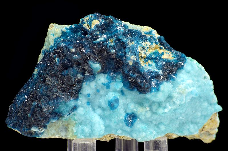 Specimen of sparkly, dark blue veszelyite crystals combined with lighter blue hemimorphite. Good colors and contrast.;Data last checked on 8th Apr 2026