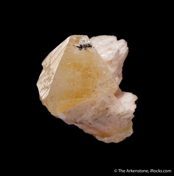This is a Powellite on Stilbite from Nashik District, Maharashtra, India. This matrix specimen is a significant thumbnail for the species, with a 1.6 cm powellite of amber color, stunning luster, and sharp gemmy termination nestled in a matrix of stilbite.Data last checked on 5th Feb 2026 - specimen may no longer be available