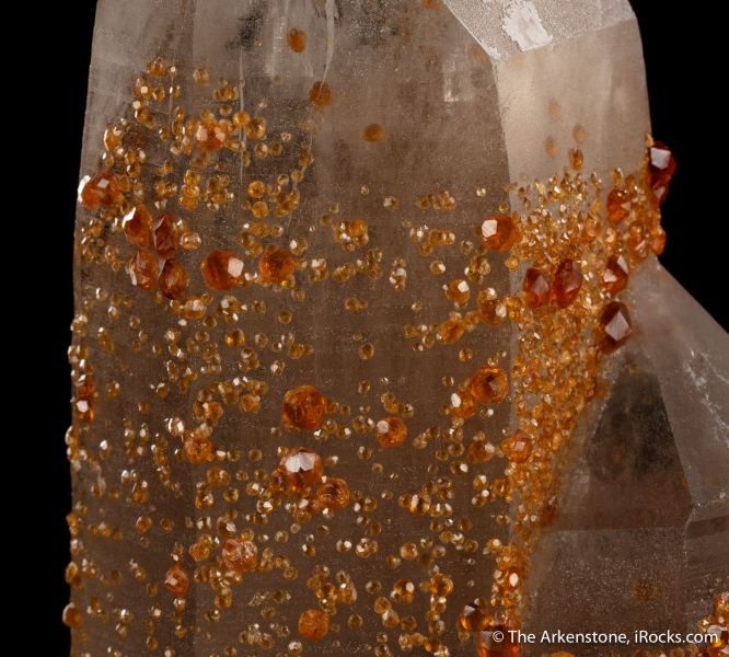 This is a Spessartine Garnet on Quartz from Wushan Spessartine Mine, Tongbei, Yunxiao Co., Zhangzhou, Fujian, China. This is a majestic, vertical crystal cluster of beautiful faintly smoky-colored quartz draped with the most sparkling, gemmy, glistening spessartine garnets, from old finds at the original Tongbei location.Data last checked on 23rd Feb 2026 - specimen may no longer be available