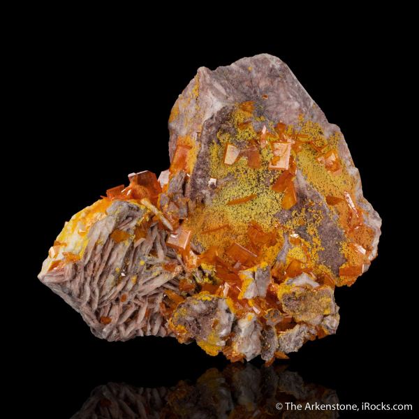 This is a Wulfenite with Mimetite from Rowley Mine, Painted Rock Mining Dist., Maricopa Co., Arizona, USA. This stunning cabinet sized specimen combines all the classic mineral finds of Rowley into one piece: sharp gem winowpanes of wulfenite to approx 1 cm, with crystallized baryte and accents of yellow mimetite.Data last checked on 28th Jan 2026